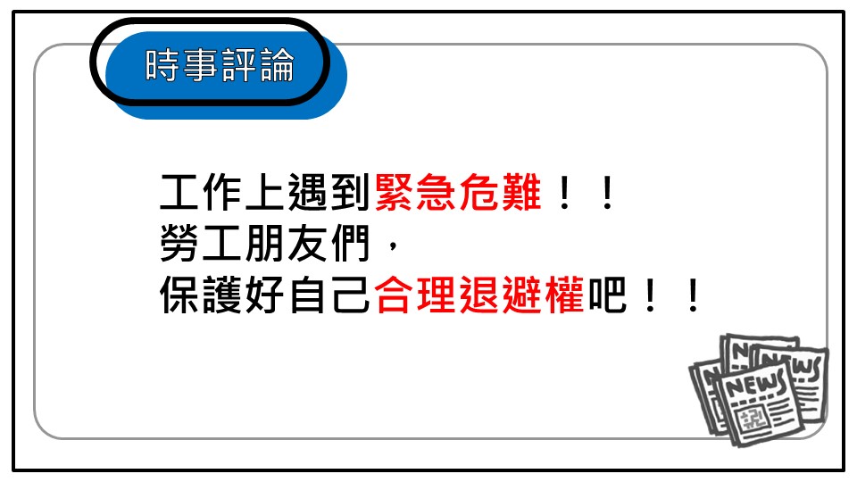 工作上遇到緊急危難!!勞工朋友們,保護好自己合理退避權吧!!工作上遇到緊急危難!!勞工朋友們,保護好自己合理退避權吧!!
