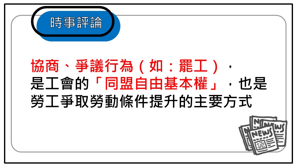 協商、爭議行為(如:罷工),是工會的「同盟自由基本權」,也是勞工爭取勞動條件提升的主要方式協商、爭議行為(如:罷工),是工會的「同盟自由基本權」,也是勞工爭取勞動條件提升的主要方式