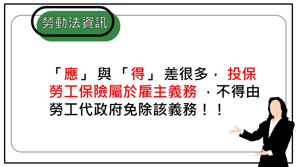 「應」 與 「得」 差很多, 投保勞工保險屬於雇主義務 ,不得由勞工代政府免除該義務!!「應」 與 「得」 差很多, 投保勞工保險屬於雇主義務 ,不得由勞工代政府免除該義務!!