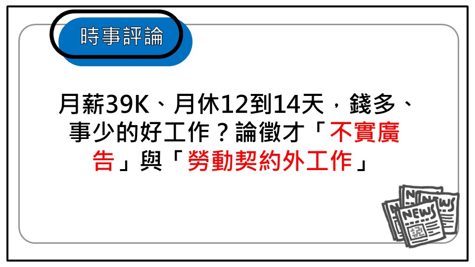 月薪39K、月休12到14天,錢多、事少的好工作?論徵才「不實廣告」與「勞動契約外工作」月薪39K、月休12到14天,錢多、事少的好工作?論徵才「不實廣告」與「勞動契約外工作」