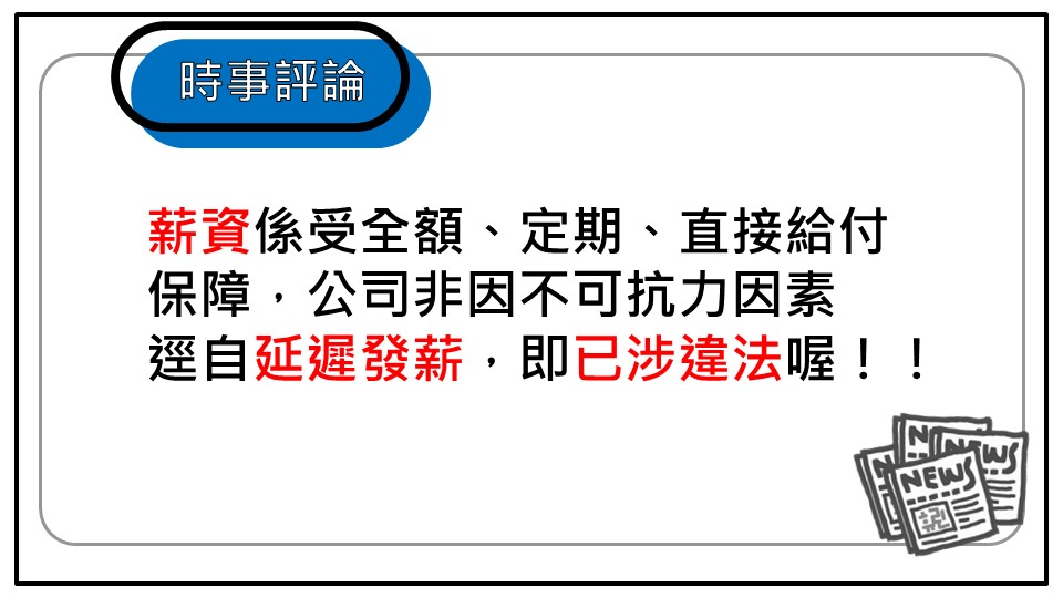 薪資係受全額、定期、直接給付保障,公司非因不可抗力因素逕自延遲發薪,即已涉違法喔!!薪資係受全額、定期、直接給付保障,公司非因不可抗力因素逕自延遲發薪,即已涉違法喔!!