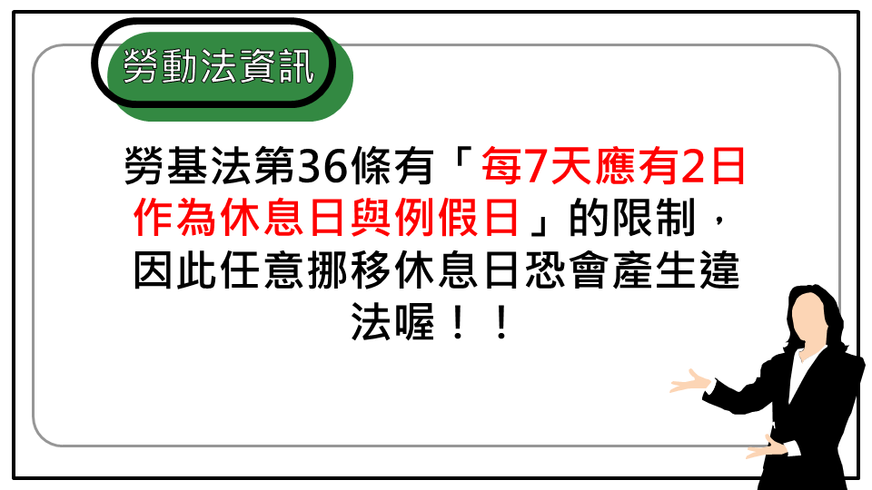 人事行政局發布之行事曆是針對公務員,並不涉及於勞工,如果公司直接比照辦理,會有很高的機率產生違法情事喔。 -