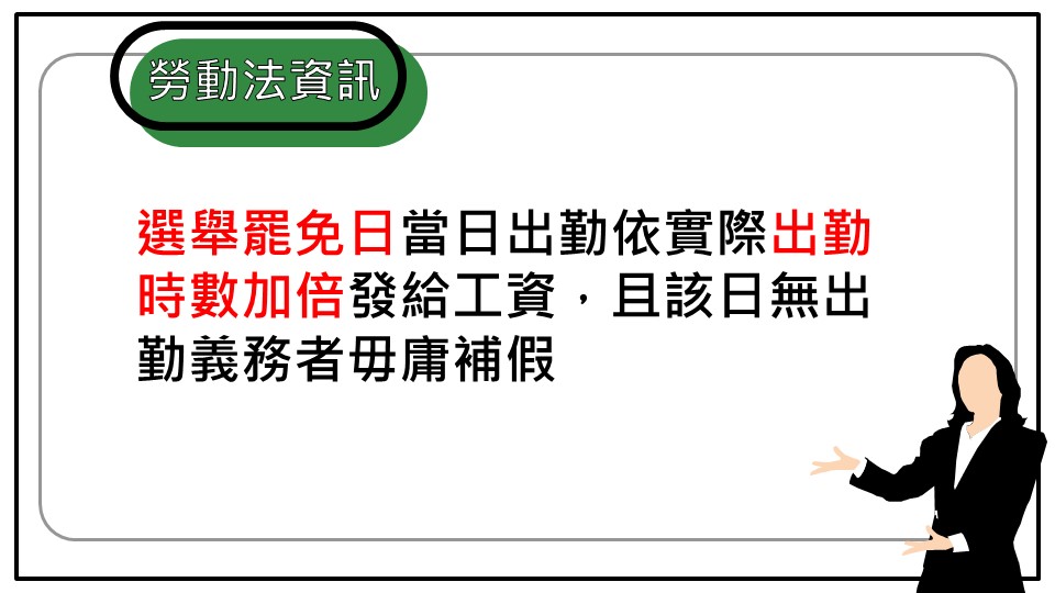 選舉罷免日當日出勤依實際出勤時數加倍發給工資,且該日無出勤義務者毋庸補假選舉罷免日當日出勤依實際出勤時數加倍發給工資,且該日無出勤義務者毋庸補假