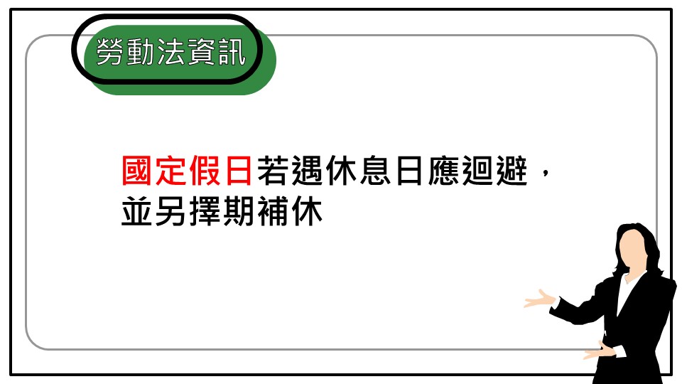 國定假日若遇休息日應迴避,並另擇期補休國定假日若遇休息日應迴避,並另擇期補休