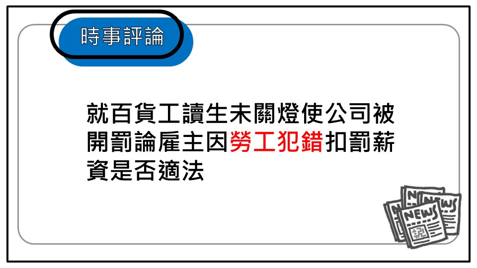 【新聞】就百貨工讀生未關燈使公司被開罰論雇主因勞工犯錯扣罰薪資是否適法【新聞】就百貨工讀生未關燈使公司被開罰論雇主因勞工犯錯扣罰薪資是否適法