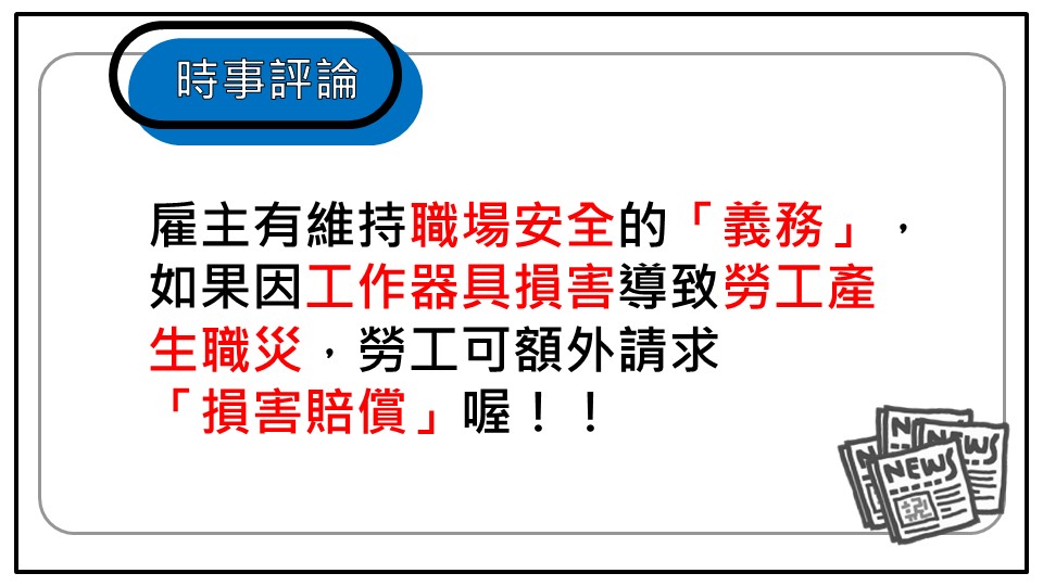 雇主有維持職場安全的「義務」,如果因工作器具損害導致勞工產生職災,勞工可額外請求「損害賠償」喔!!