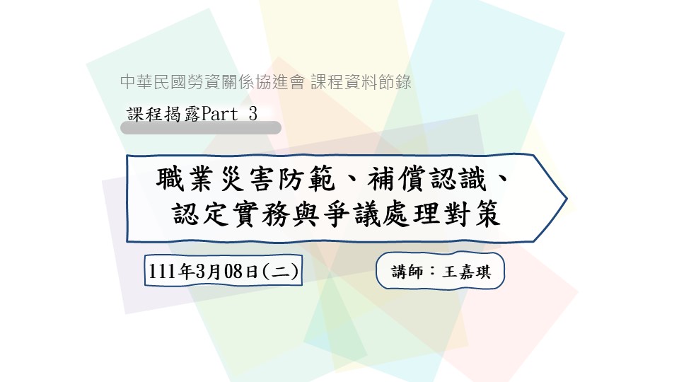 【3月08日 職業災害防範、補償認識、認定實務與爭議處理對策】課程事前揭露Part 3