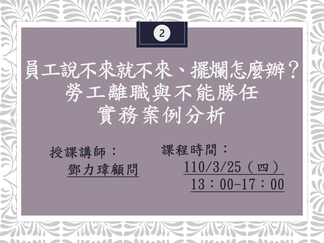 因應雇主經營需求,以及實務管理之必要,本會特於110年3月下旬,開辦以下課程,詳情可至下列連結網站查看,或追蹤本會以取得課程事前接露: