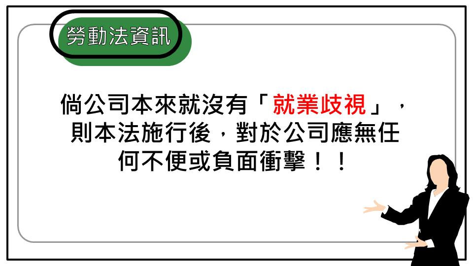 倘公司本來就沒有「就業歧視」,則本法施行後,對於公司應無任何不便或負面衝擊;反之,若雇主過往就有「就業歧視」,則無論本法有無施行,行政機關皆可依法裁處,僅僅是適用法規的不同罷了!!而本法施行的目的係以促進中高齡者就業,因此可以期待未來主管機關將可能因應本法,提供更多獎助聘僱津貼與方案,此點就需要人資夥伴努力追蹤了喔。 -